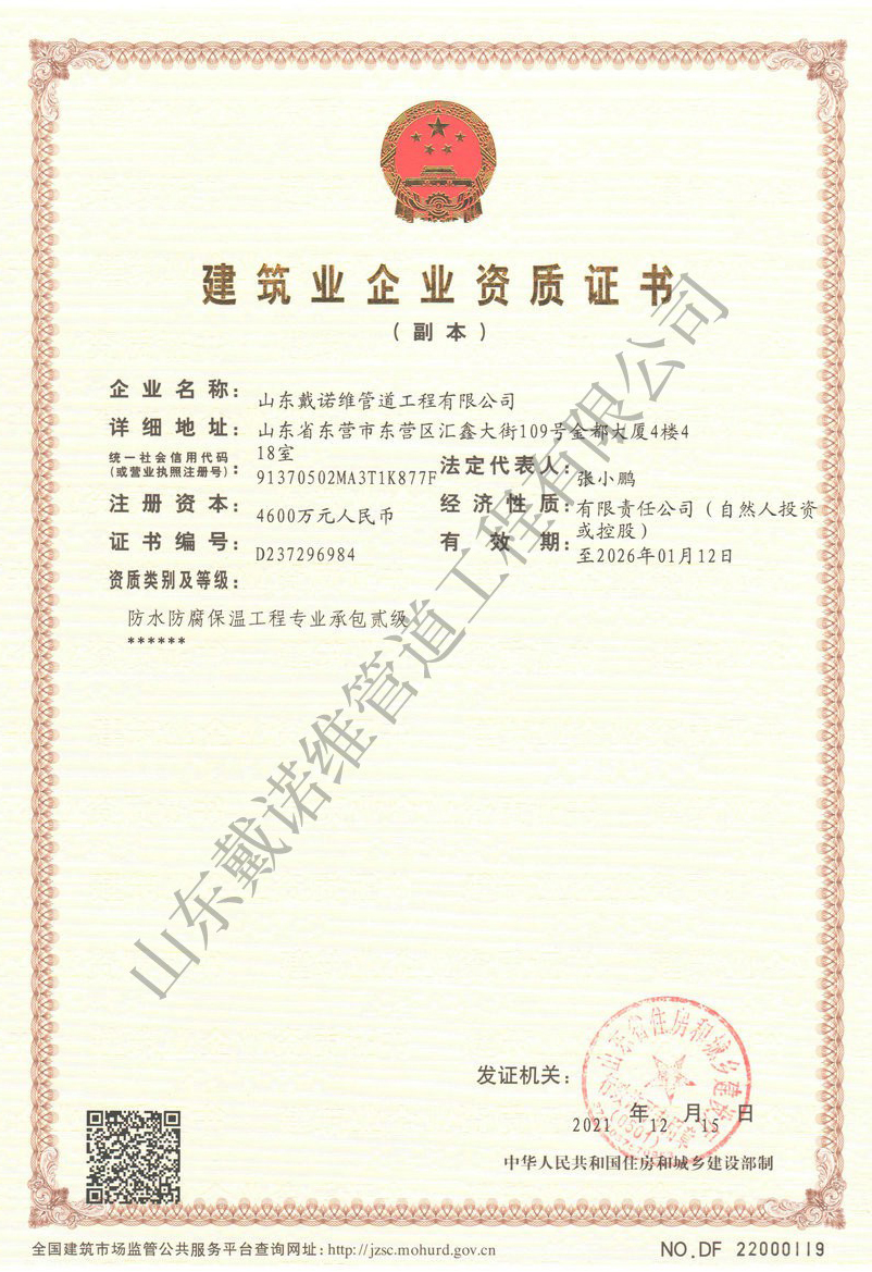 管道非開挖修復(fù)工程服務(wù)企業(yè)資質(zhì)證書