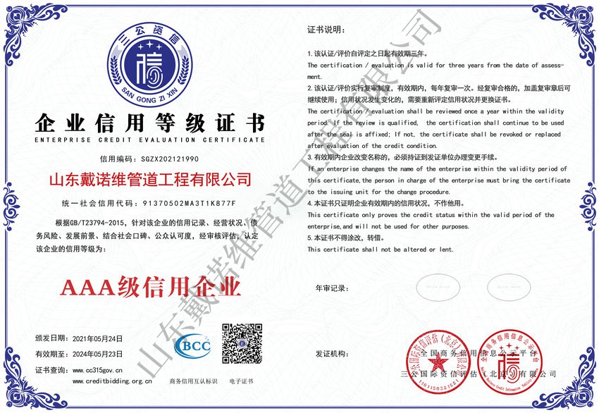 管道非開挖修復工程服務企業(yè)資質(zhì)證書
