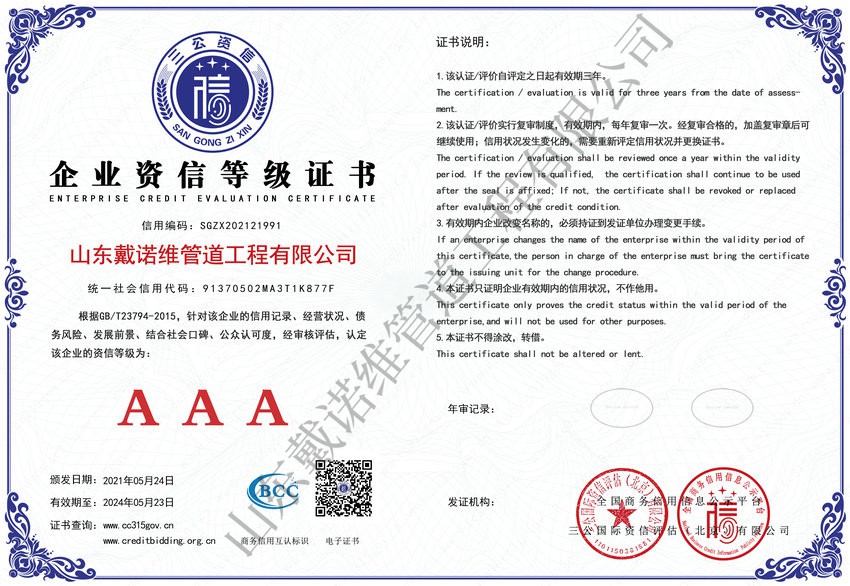 管道非開挖修復工程服務企業(yè)資質(zhì)證書